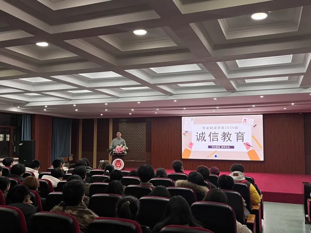 为培育良好学风,塑造严谨考风,营造公平公正的考试环境,智能制造学院24级辅导员张健老师为机械设计制造及其自动化、机器人工程、电子信息科学与技术、自动化、新能源汽车工程的同学们召开了诚信考试教育大会。