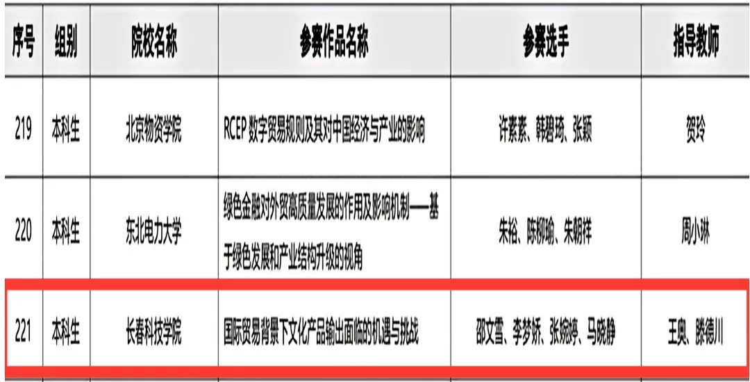 经济与管理学院国际经济与贸易、金融学、工商管理、人力资源管理、金融工程等专业学生参加本次大赛。赛项设置包括RCEP国际市场开拓赛道、国际贸易与商务专题赛道、技术性贸易措施评议赛道、涉外商事法律赛道。经济与管理学院国际经济与贸易专业学生和工商管理专业学生在国际贸易与商务专题赛道中荣获国赛2等奖;金融学、金融工程、人力资源管理专业在国际贸易与商务专题和RCEP国际市场开拓赛道中荣获国赛3等奖。